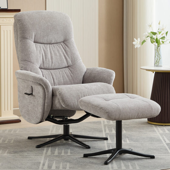 Create a serene space to unwind with the Furniture in Fashion Nepean Fabric Recliner Chair With Stool In Cloud. This elegantly designed recliner chair features soft-touch fabric in a calming Cloud grey tone, making it a stylish and versatile addition to any modern or classic interior. With its minimalist design and inviting silhouette, the Nepean recliner offers the perfect balance of aesthetics and functionality for your home. Paired with a matching footstool, the Nepean recliner is built for all-day comfort. The high backrest, plush cushioning, and easy reclining mechanism ensure an ergonomic seating experience, whether you’re enjoying a good book, watching TV, or simply relaxing. Built with quality materials and a sturdy frame, this Furniture in Fashion piece delivers timeless style and dependable comfort for everyday use. Experience comfort without compromise with the Furniture in Fashion Nepean Fabric Recliner Chair With Stool In Cloud a perfect combination of style, support, and everyday luxury that enhances any living space. FEATURES : Material : Fabric, Wooden, Metal Finish : Cloud, Black, Oak The Nepean Swivel Recliner is the perfect combination of comfort and style With a smooth swivel function and a sleek manual lever, it allows you to effortlessly recline into your ideal positions Upholstered in soft, high-quality fabric and available in three versatile shades, the Nepean is an excellent addition to any modern home Effortless Recline : Smooth swivel function and easy-to-use manual lever for adjustable comfort High-Quality Fabric Upholstery : Soft, durable fabric available in three versatile shades, perfect for modern interiors Stylish and Comfortable : Designed for both style and relaxation, adding a chic touch to any living space Ideal for Any Home : A perfect addition to contemporary homes, offering both comfort and a sleek look Ergonomic high backrest and padded armrests offer excellent posture support Sturdy metal base and dur